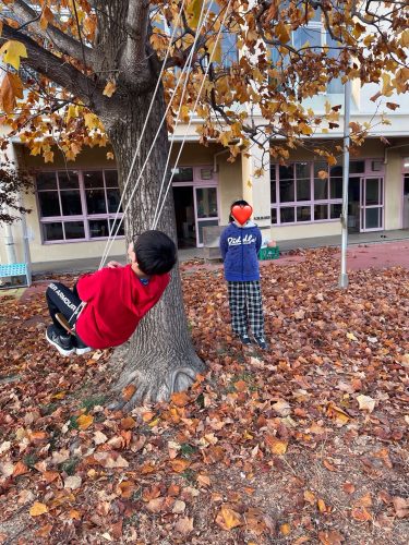 今日のトピックスは園庭の木にブランコが取り付けられたこと!